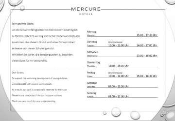 Für Entspannung nach der Arbeit ist der Schwimm- und Saunabereich wie folgt geöffnet. Schwimmbad:...