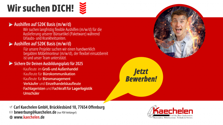 Wir freuen uns auf Eure Bewerbungen per Post oder per E-Mail an bewerbung@kaechelen.de